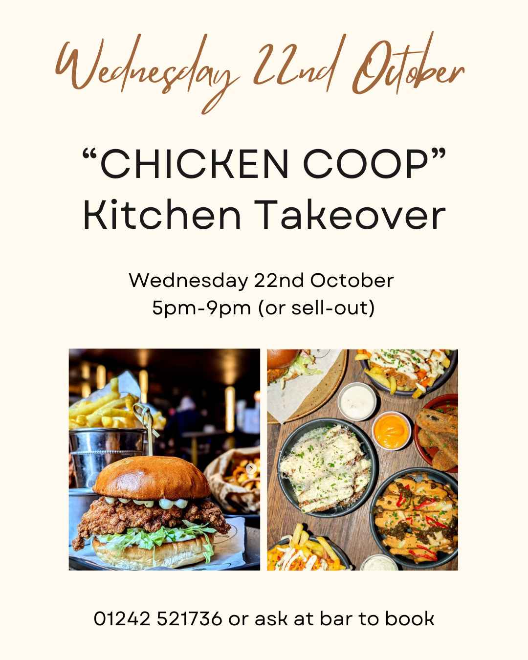 Coops is taking over our kitchen on 22nd Oct. Book a table, enjoy the Champions league and the finest chicken in Cheltenham!